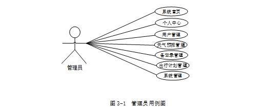 (a) 管理员;管理员使用本系统涉到的功能主要有:系统首页、个人中心、用户管理、天气预报管理、备忘录管理、出行计划管理、系统管理等功能。管理员用例图如图3-1所示。