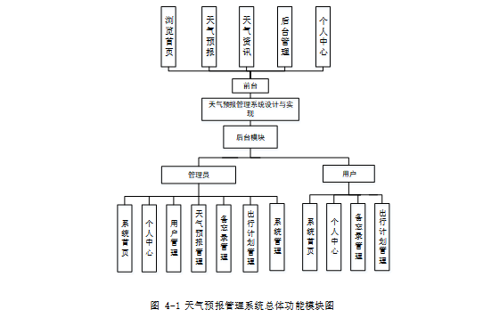 天气预报管理系统采用了结构化开发的方法。这种开发方法的优点是控制性比较强,开发过程中采用了结构化和模块化的设计思想,自顶向下,从总体到部分,合理划分系统的结构和模块[11]。结构化开发时使用模块式开发,各模块之间互不影响,方便系统的开发与管理。 网站总体功能如下图所示: