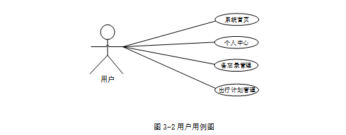 (b) 用户;进入系统可以实现系统首页、个人中心、备忘录管理、出行计划管理等功能进行操作。用户用例图如图3-2所示。