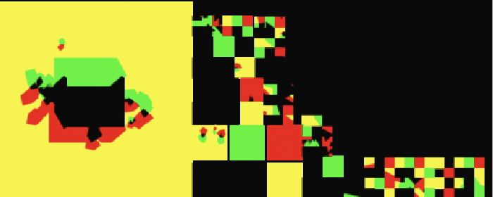 检查烘焙的阴影遮罩贴图可以发现阴影已正确烘焙:仅受第一个光源照亮的区域显示红色,仅受第二个光源照亮的区域显示绿色,同时受两个光源照亮的区域显示黄色。这最多支持四个光源,不过第四个光源在预览中不可见(因为不显示Alpha通道)