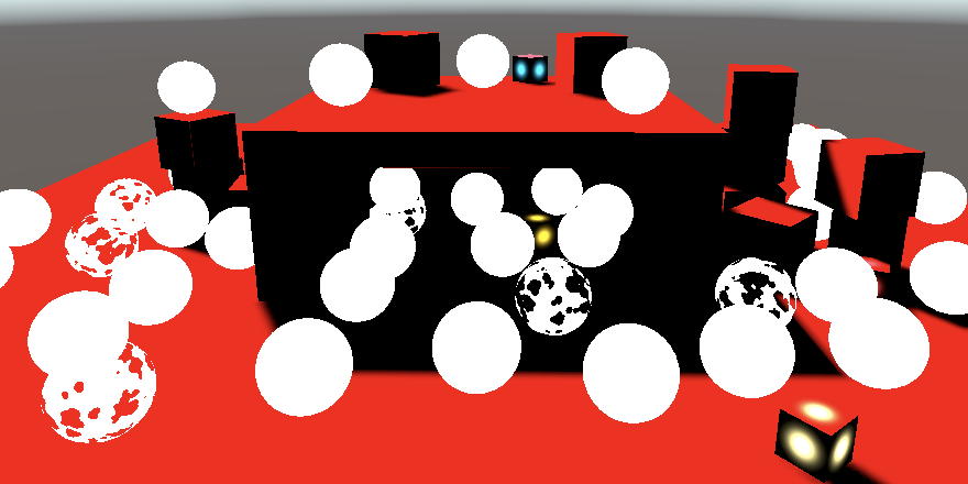 我们可以看到阴影遮罩正确应用到了光照贴图对象上。同时如预期那样,动态物体没有阴影遮罩数据——它们使用光照探针而非光照贴图。不过,Unity也会将阴影遮罩数据烘焙到光照探针中(称为遮蔽探针)。我们可以在UnityInput的UnityPerDraw缓冲区中添加unity_ProbesOcclusion向量来访问这些数据,请将其放置在世界变换参数和光照贴图UV变换向量之间。