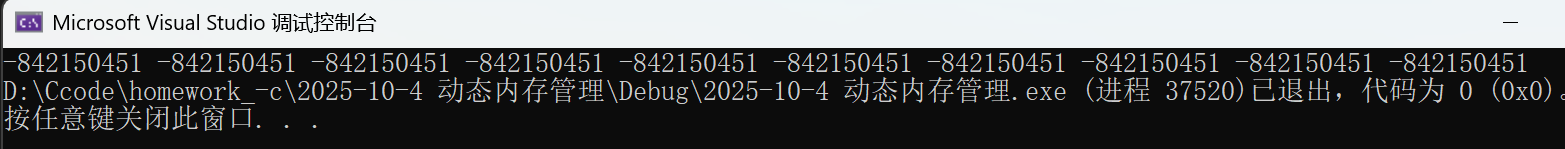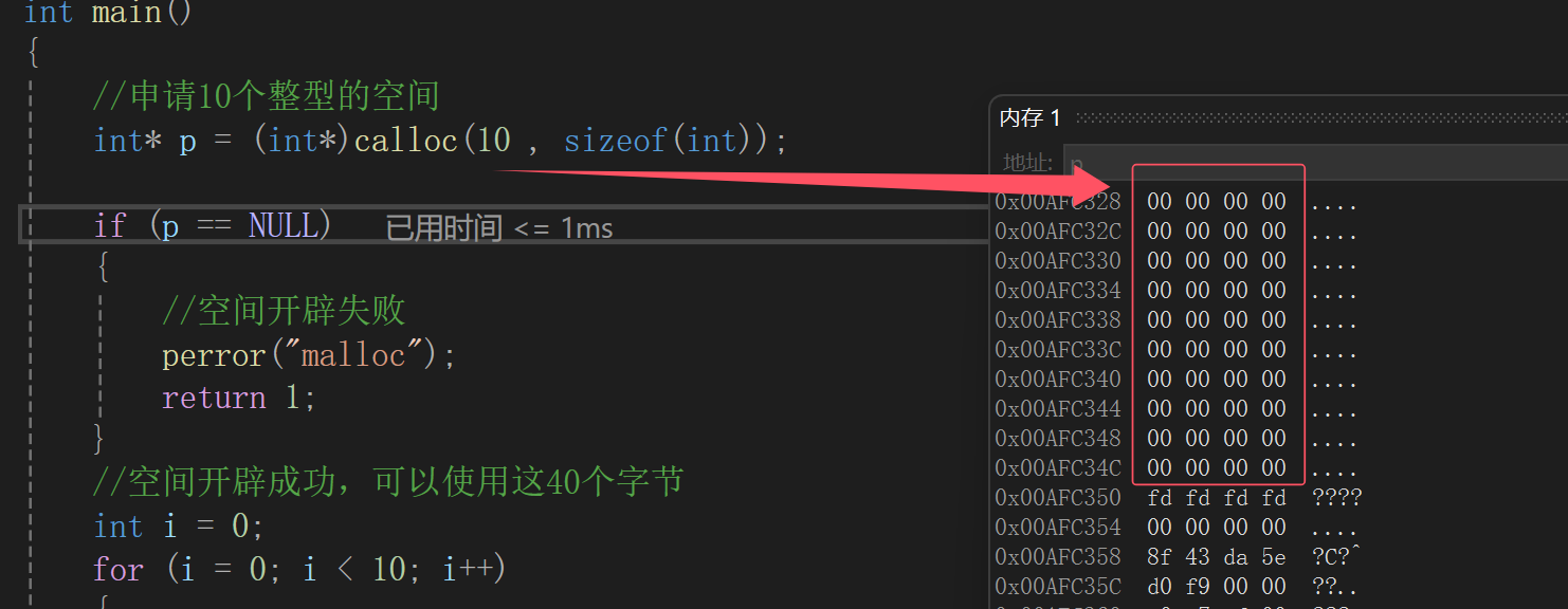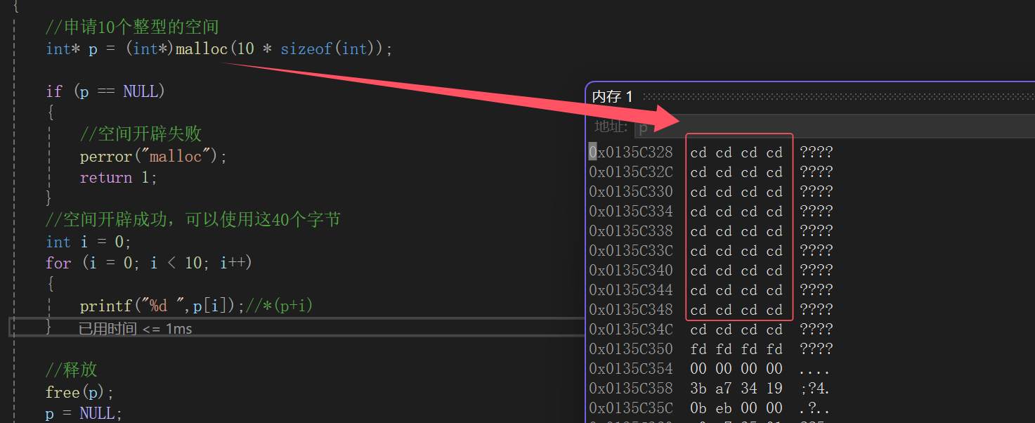 #include <stdio.h> int main() {//申请10个整型的空间int* p = (int*)malloc(10 * sizeof(int));if (p == NULL){//空间开辟失败perror("malloc");return 1;}//空间开辟成功,可以使用这40个字节int i = 0;for (i = 0; i < 10; i++){printf("%d ",p[i]);//*(p+i)}//释放free(p);p = NULL;return 0; }
