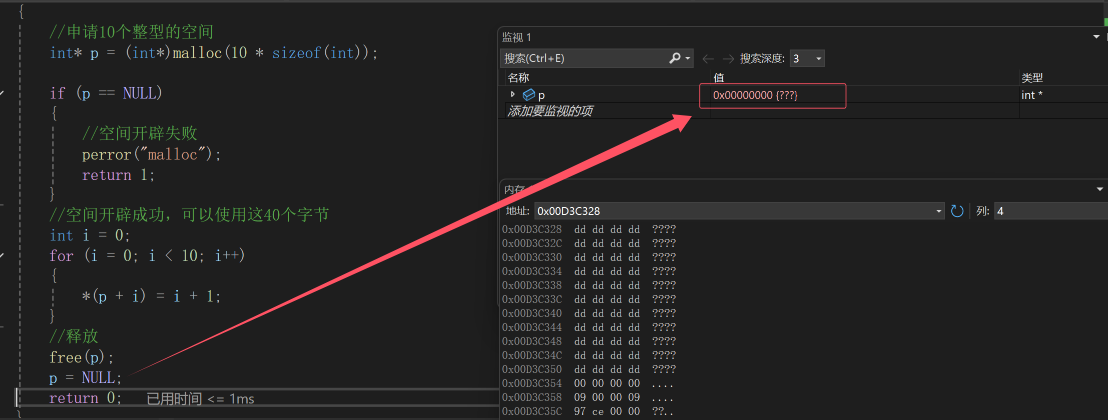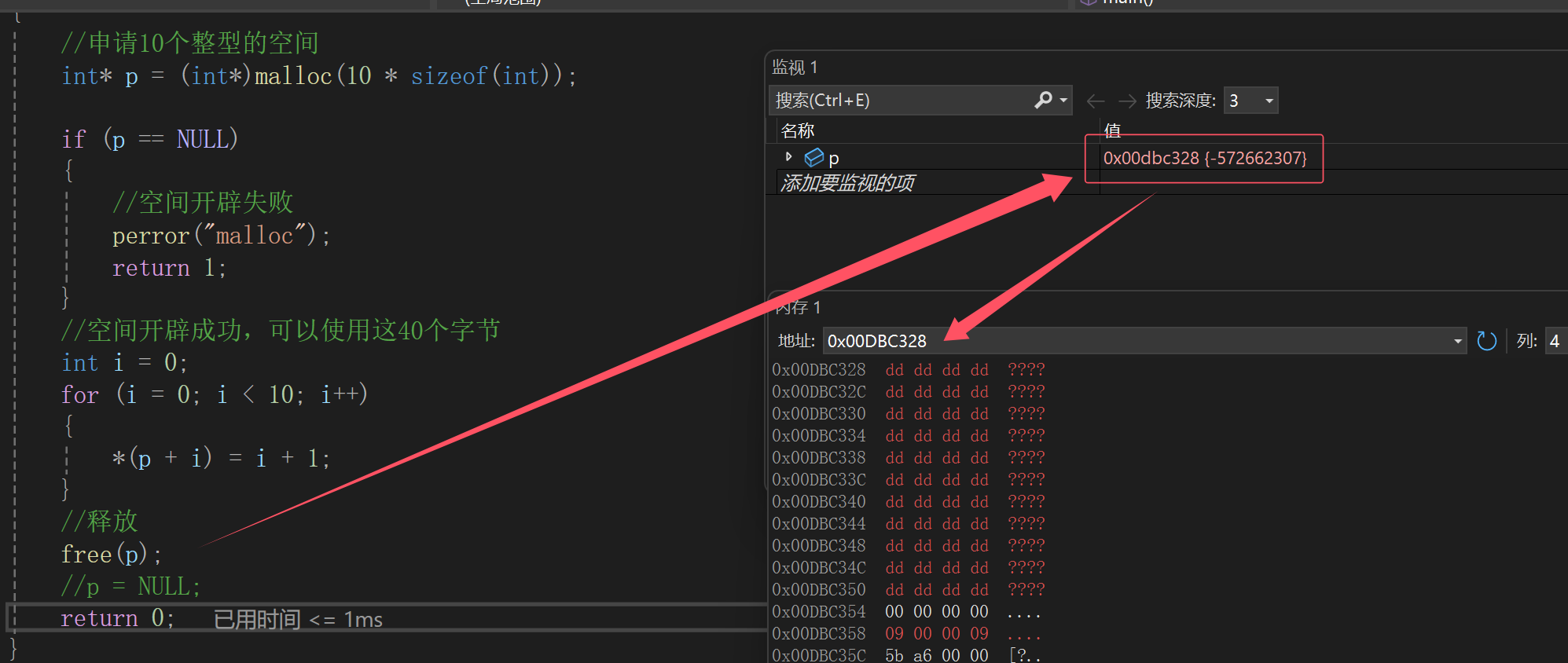 {//申请10个整型的空间int* p = (int*)malloc(10 * sizeof(int));if (p == NULL){//空间开辟失败perror("malloc");return 1;}//空间开辟成功,可以使用这40个字节int i = 0;for (i = 0; i < 10; i++){*(p + i) = i + 1;}//释放free(p);p = NULL;return 0;