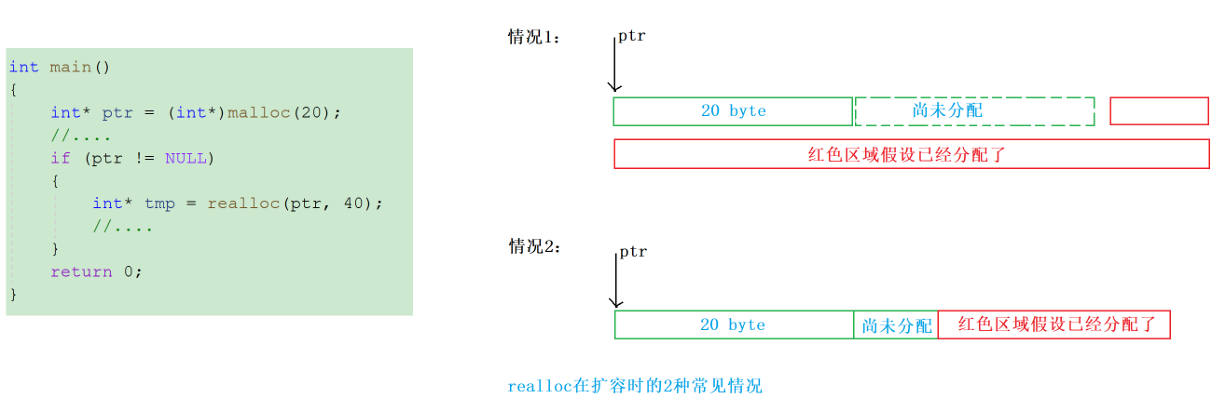 int main() {//正常用法//int* p = (int*)malloc(20);//realloc(p, 40);//malloc==reallocint* p = (int*)realloc(NULL, 40);//==malloc(40)if (p == NULL){//....return 1;}free(p);p = NULL;return 0; }