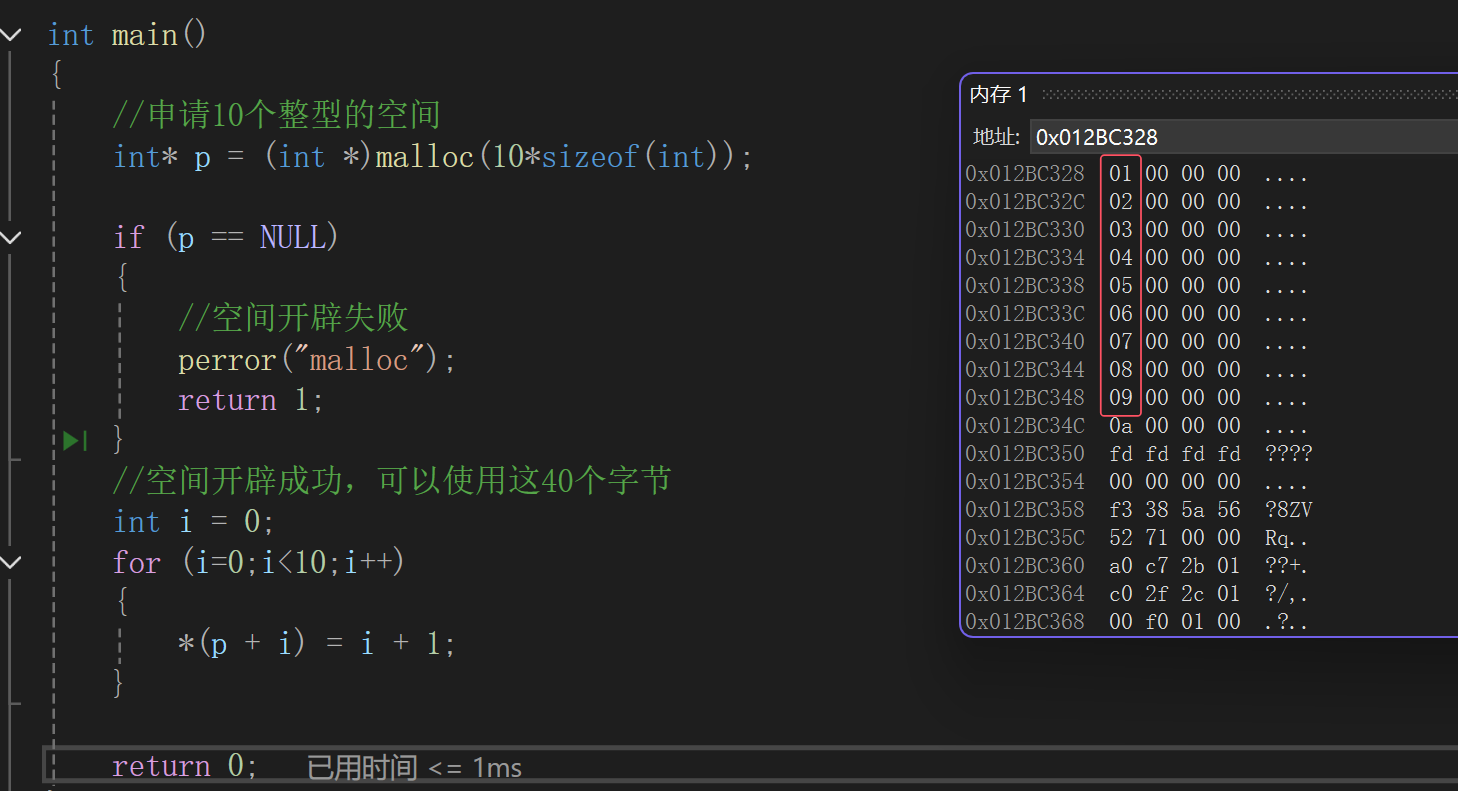{//申请10个整型的空间int* p = (int *)malloc(10*sizeof(int));if (p == NULL){//空间开辟失败perror("malloc");return 1;}//空间开辟成功,可以使用这40个字节int i = 0;for (i=0;i<10;i++){*(p + i) = i + 1;}return 0;