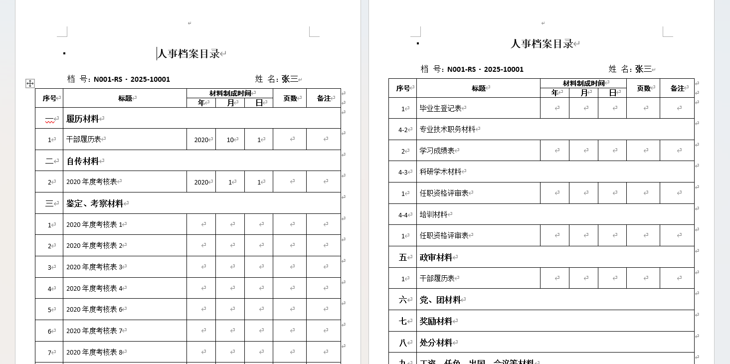 系统提供灵活且强大的干部人事档案目录打印功能。用户可以根据上级要求或本单位规定,自定义Word打印模板,对字体、字号、页眉页脚等进行细致调整。系统支持根据档号等信息,批量生成或合并多个目录打印文件(DOCX格式),并允许设置固定行数、保留标题表头等细节,以满足规范的打印输出需求