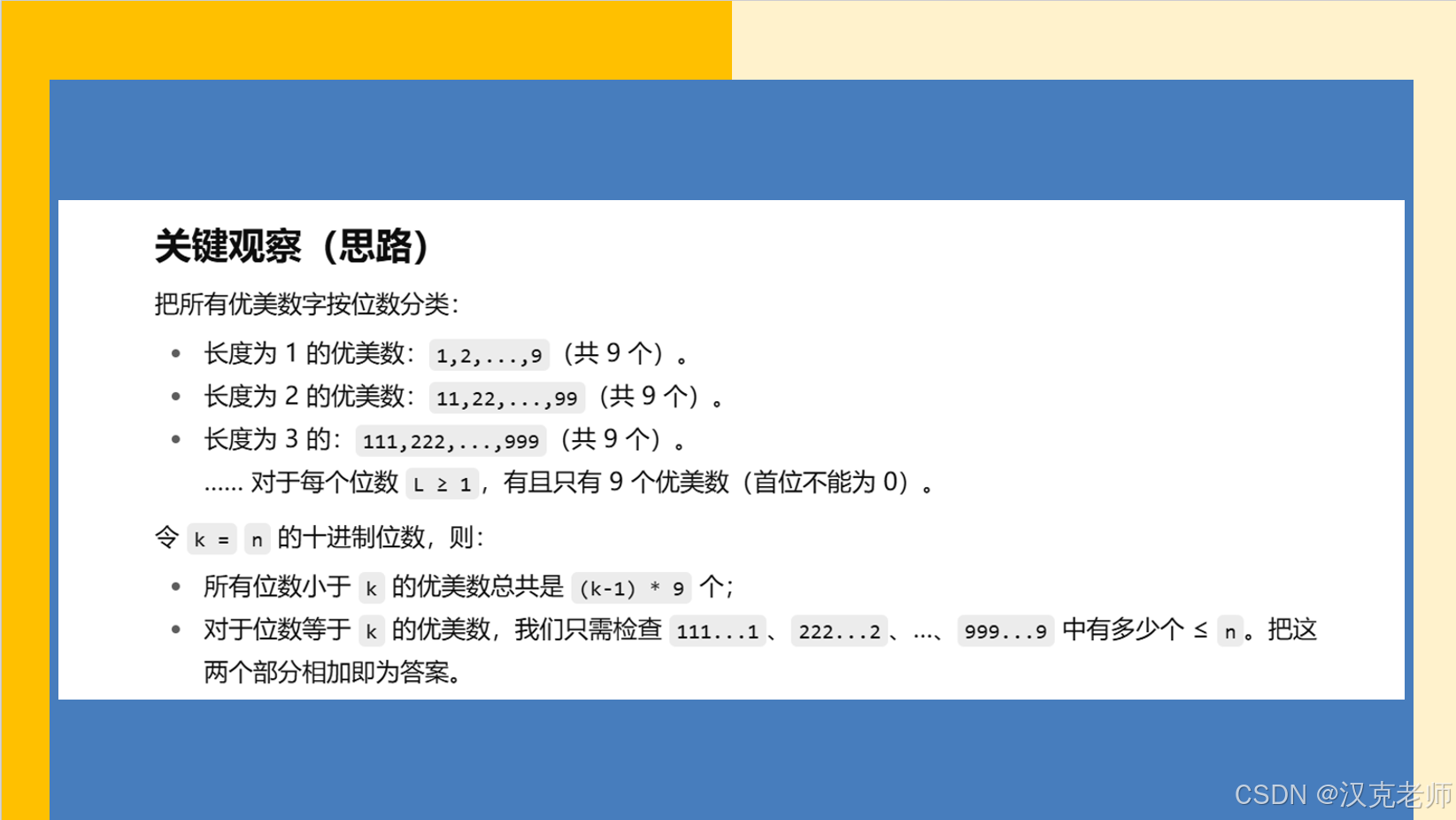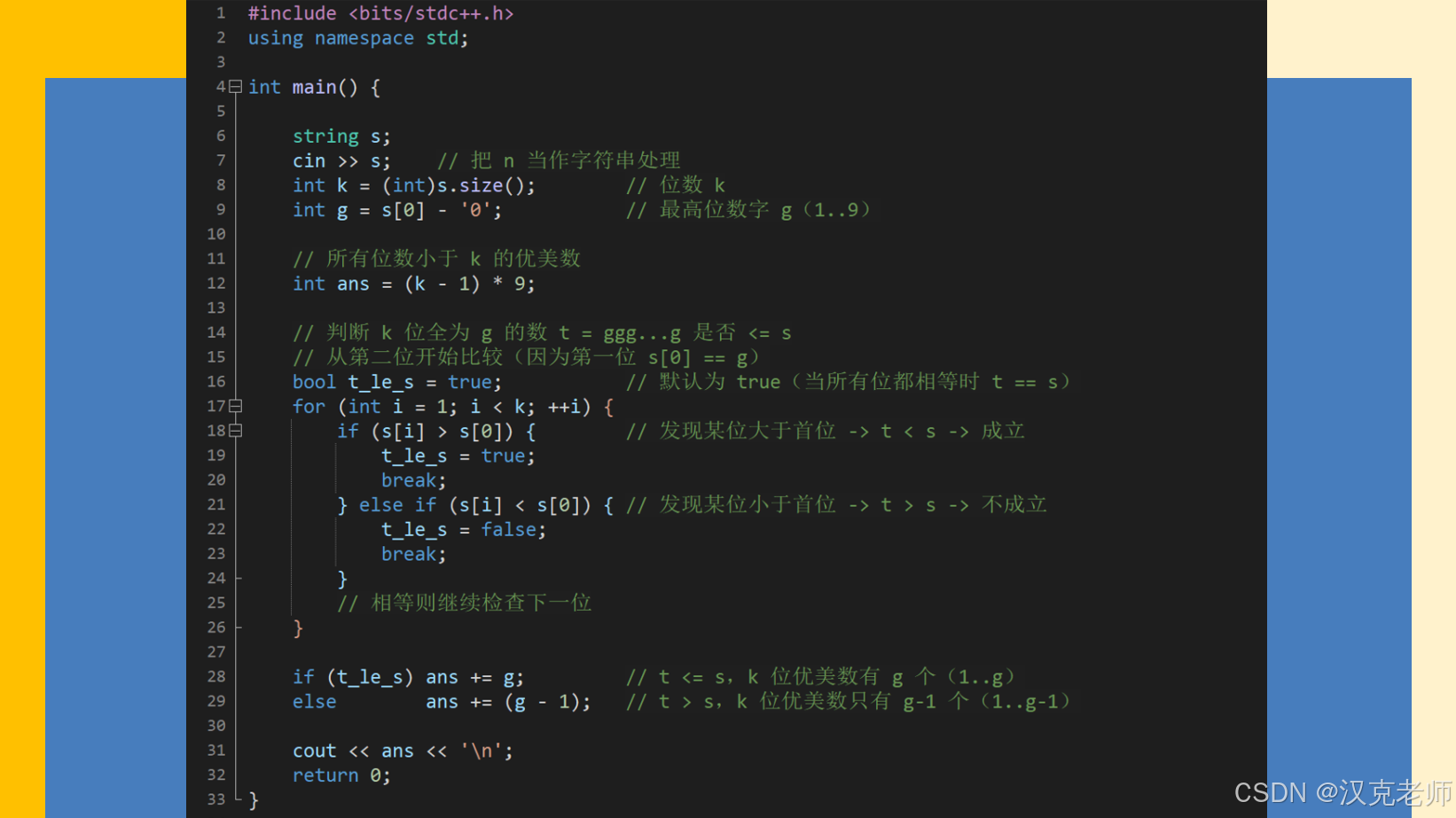 using namespace std;int main() {string s;cin >> s; // 把 n 当作字符串处理int k = (int)s.size(); // 位数 kint g = s[0] - '0'; // 最高位数字 g(1..9)// 所有位数小于 k 的优美数int ans = (k - 1) * 9;// 判断 k 位全为 g 的数 t = ggg...g 是否 <= s// 从第二位开始比较(因为第一位 s[0] == g)bool t_le_s = true; // 默认为 true(当所有位都相等时 t == s)for (int i = 1; i < k; ++i) {if (s[i] > s[0]) { // 发现某位大于首位 -> t < s -> 成立t_le_s = true;break;} else if (s[i] < s[0]) { // 发现某位小于首位 -> t > s -> 不成立t_le_s = false;break;}// 相等则继续检查下一位}if (t_le_s) ans += g; // t <= s,k 位优美数有 g 个(1..g)else ans += (g - 1); // t > s,k 位优美数只有 g-1 个(1..g-1)cout << ans << '\n';return 0;