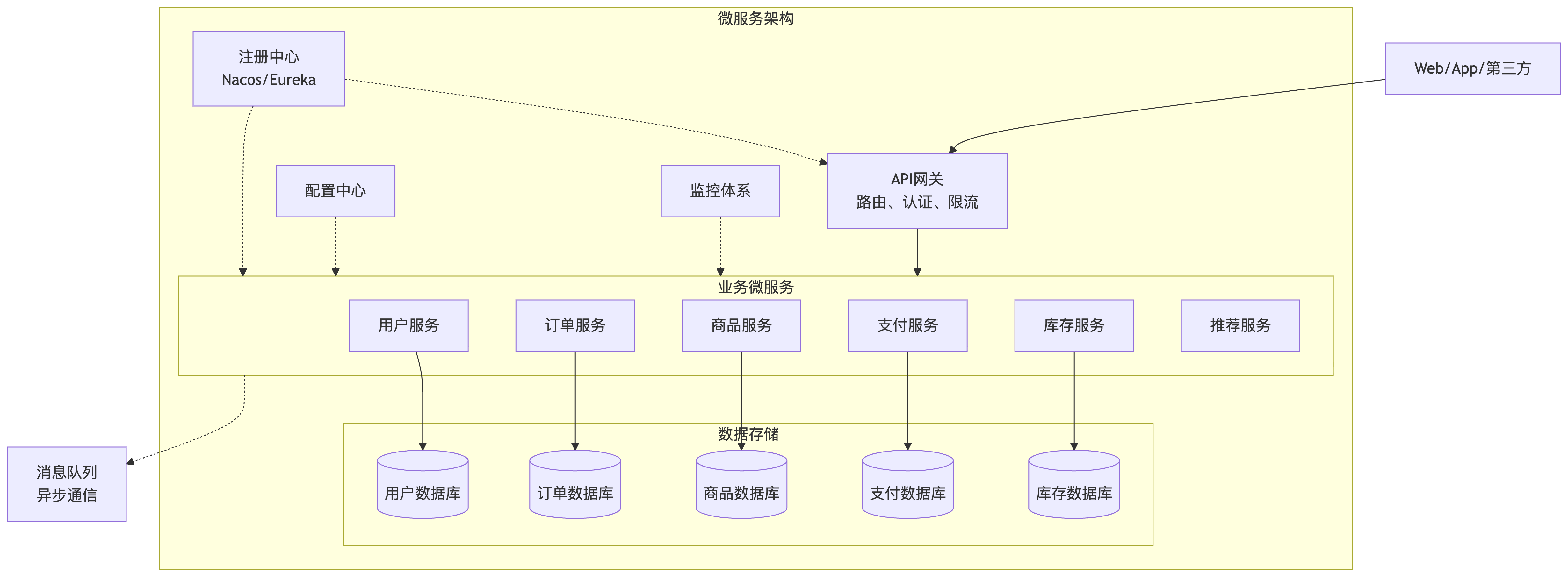将应用彻底拆分为一个个小的、可独立部署的微服务,每个服务有自己的数据库。服务间通过API(如REST, RPC)协作。