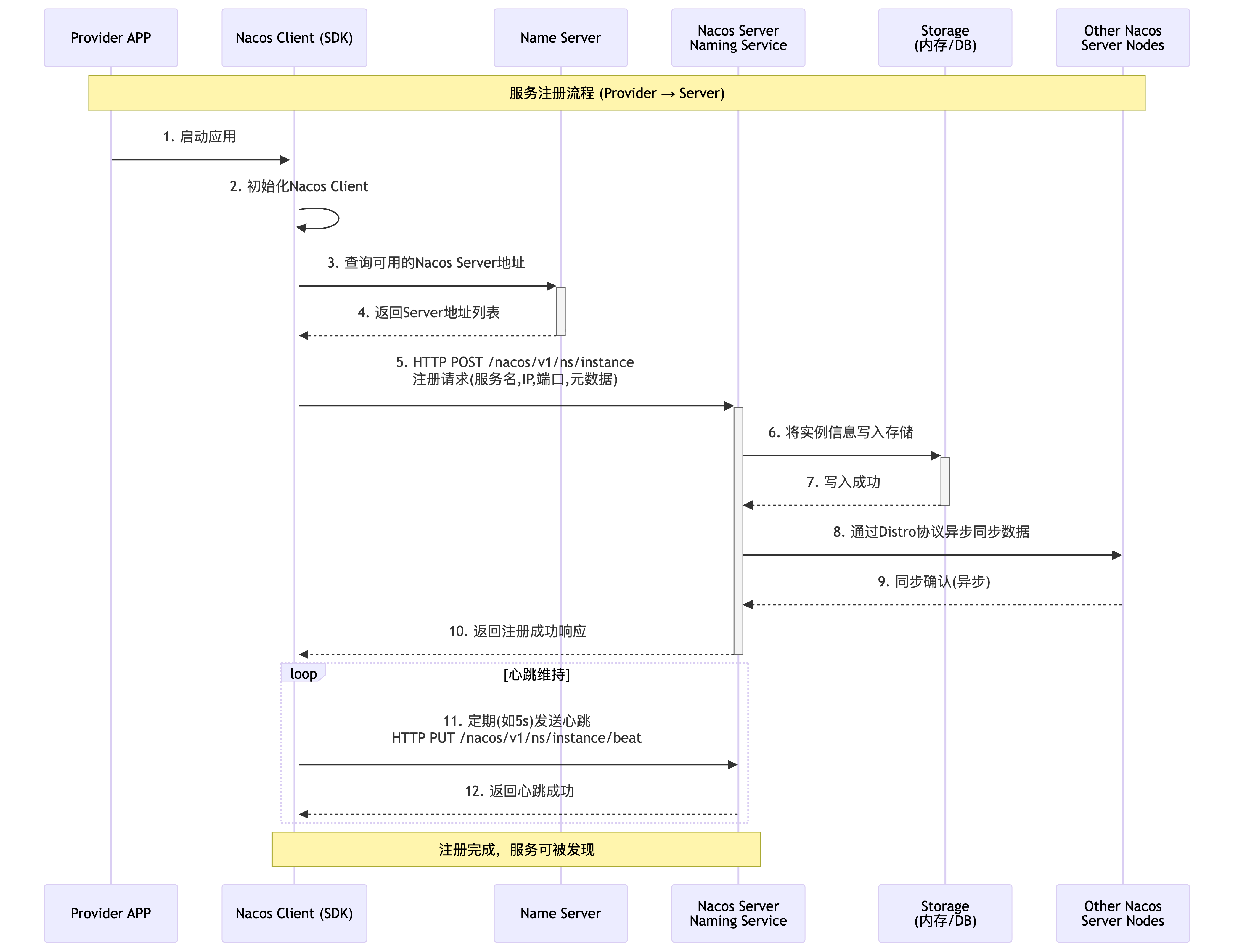 。 - Nacos Server 接收到请求后,会将这个实例信息存储到其内置的注册表(一个双层的 ConcurrentMap)中。