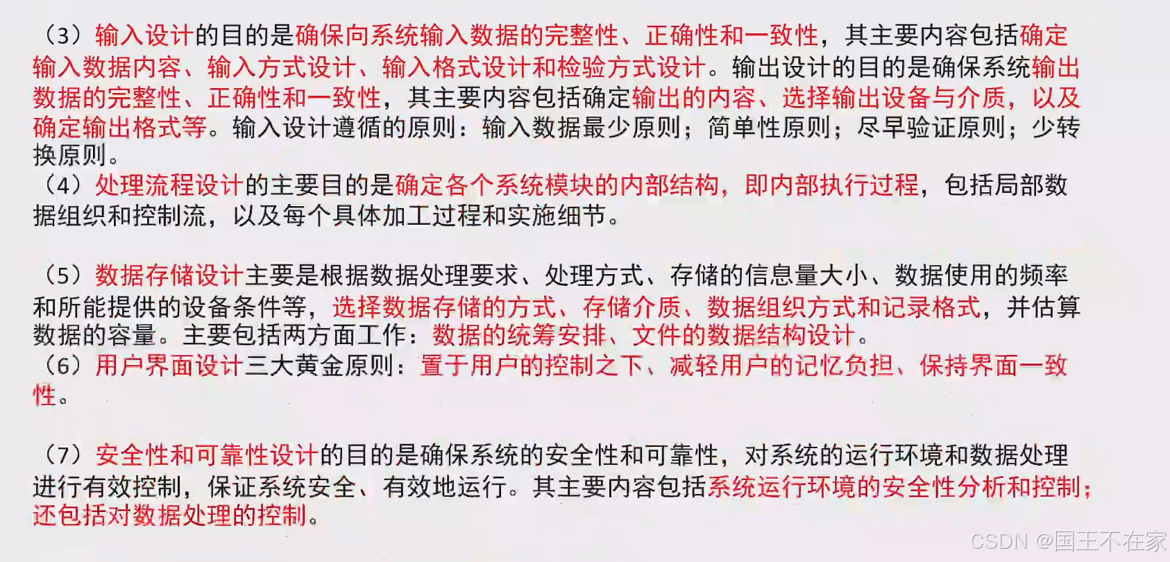简单举例:银行存款系统中,处理流程设计可能定义为“用户输入金额 → 系统验证账户有效性 → 计算新余额 → 更新数据库 → 打印凭条”4。这一步是系统实现前的“蓝图”,直接影响开发质量和用户体验