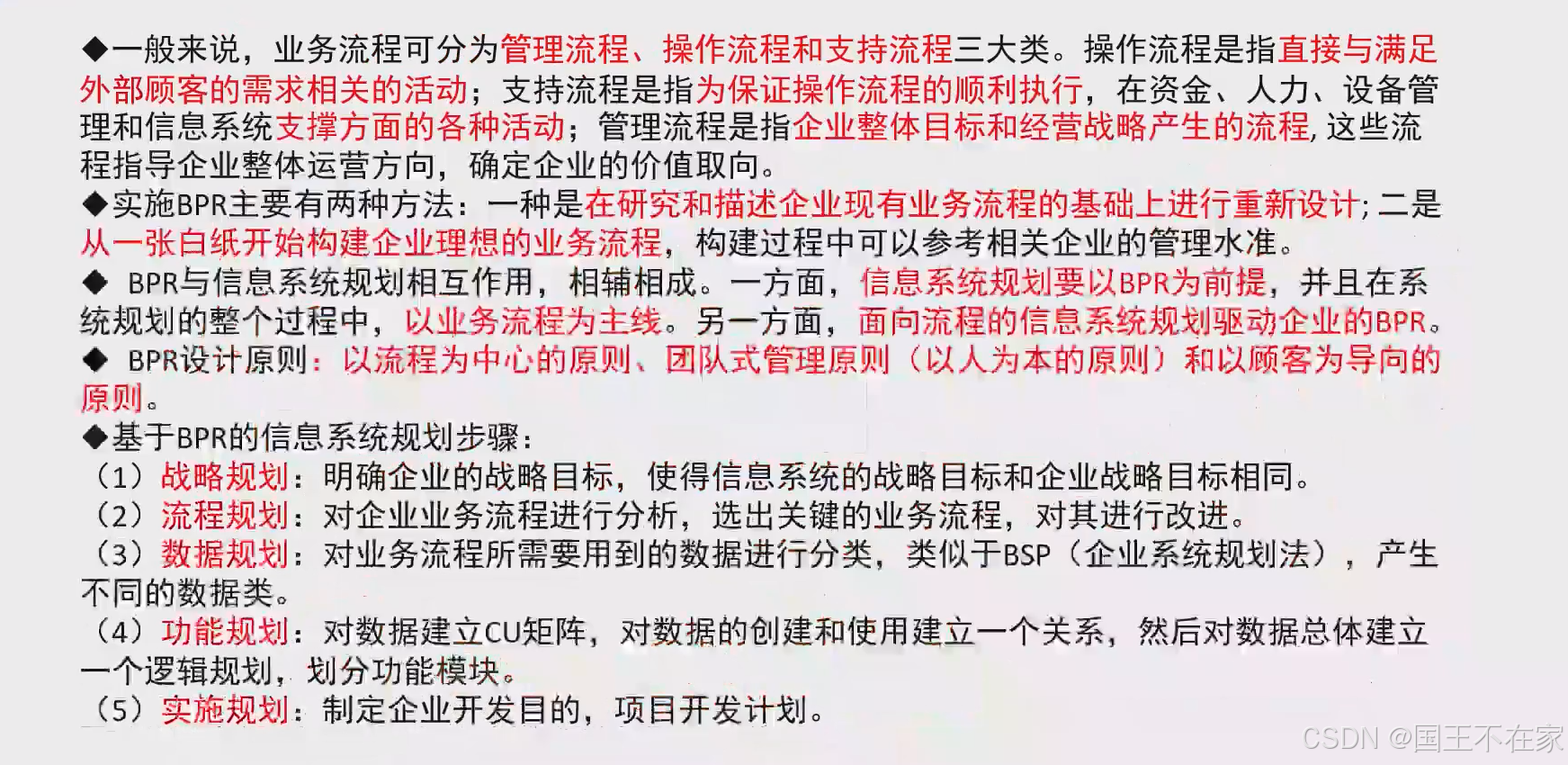 - BPR与信息系统规划相互作用,信息规划以BPR为前提,以业务流程为主线,面相流程的信息系统规划驱动企业的BPR。