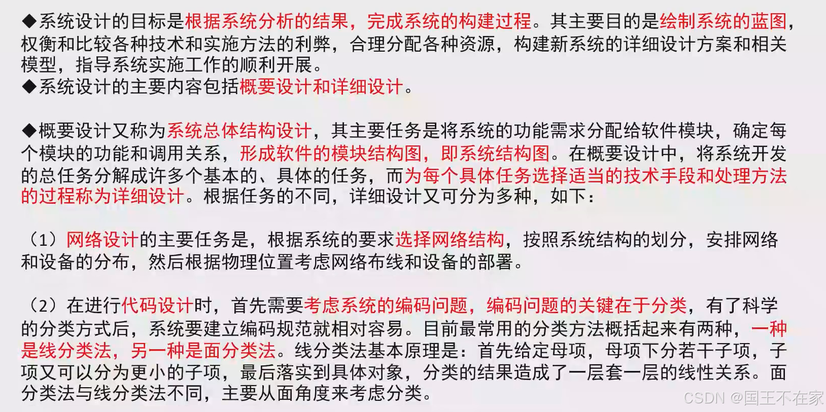 - 在概要设计中,将系统开发的总任务分解成许多个基本的、具体的任务,而为每个具体任务选择适当的技术手段和处理方法的过程称为详细设计。