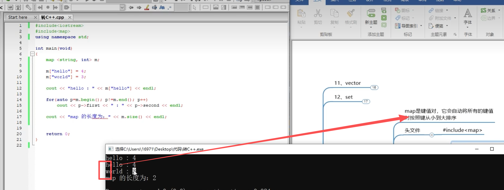 int main(void){map <string,int> m;m["hello"] = 2;m["world"] = 3;cout << "hello:" << m["hello"] << endl;for(auto p=m.begin(); p!=m.end(); p++)cout << p->first << ":" << p->second << endl;return 0;