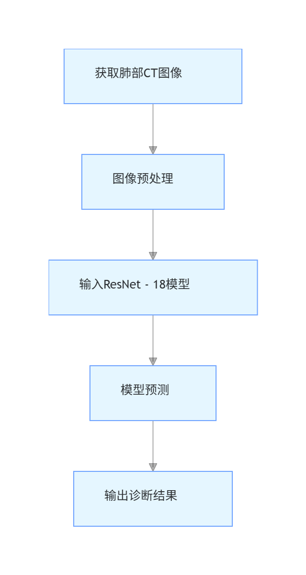graph TD;A[获取肺部CT图像] --> B[图像预处理];B --> C[输入ResNet - 18模型];C --> D[模型预测];D --> E[输出诊断结果];