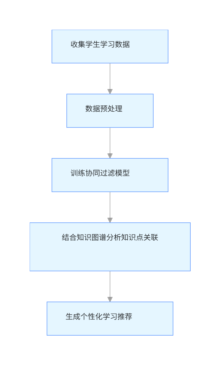 graph TD;A[收集学生学习数据] --> B[数据预处理];B --> C[训练协同过滤模型];C --> D[结合知识图谱分析知识点关联];D --> E[生成个性化学习推荐];