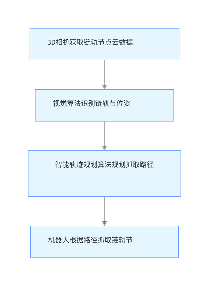 graph TD;A[3D相机获取链轨节点云数据] --> B[视觉算法识别链轨节位姿];B --> C[智能轨迹规划算法规划抓取路径];C --> D[机器人根据路径抓取链轨节];