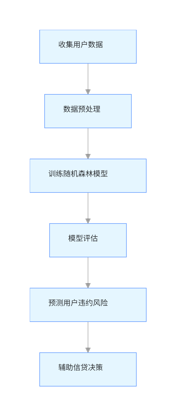 graph TD;A[收集用户数据] --> B[数据预处理];B --> C[训练随机森林模型];C --> D[模型评估];D --> E[预测用户违约风险];E --> F[辅助信贷决策];