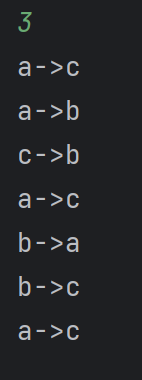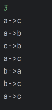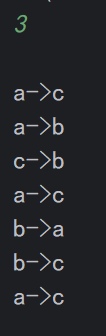 def hanoi(n, A, B, C):"""将柱A上的n个圆盘按规则搬到C上,B做辅助柱"""if n == 1:move(A, 1, C) # 将编号为1的圆盘从A柱移到C柱else:hanoi(n-1, A, C, B) # 将A上编号为1至n-1的圆盘移到B, C做辅助柱move(A, n, C) # 将编号为n的圆盘从A移到Chanoi(n-1, B, A, C) # 将B上编号为1至n-1的圆盘移到C, A做辅助柱def move(A, n, B):"""打印从A柱移动第n号圆盘到B柱的过程"""print(f"{A}->{B}")if __name__ == "__main__":n = int(input())hanoi(n, 'a', 'b', 'c')
