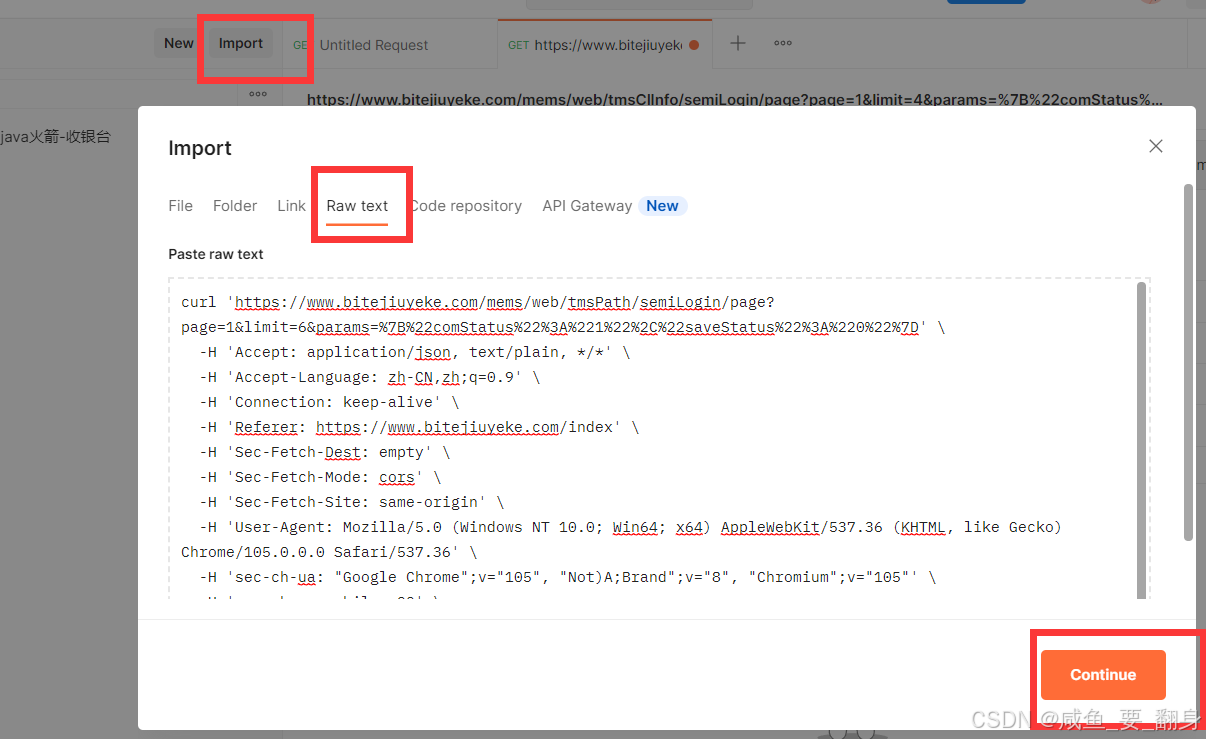一键导入:从浏览器开发者工具中复制一个请求的cURL命令,在Postman中点击 “Import” -> “Raw text”,粘贴即可自动生成请求。