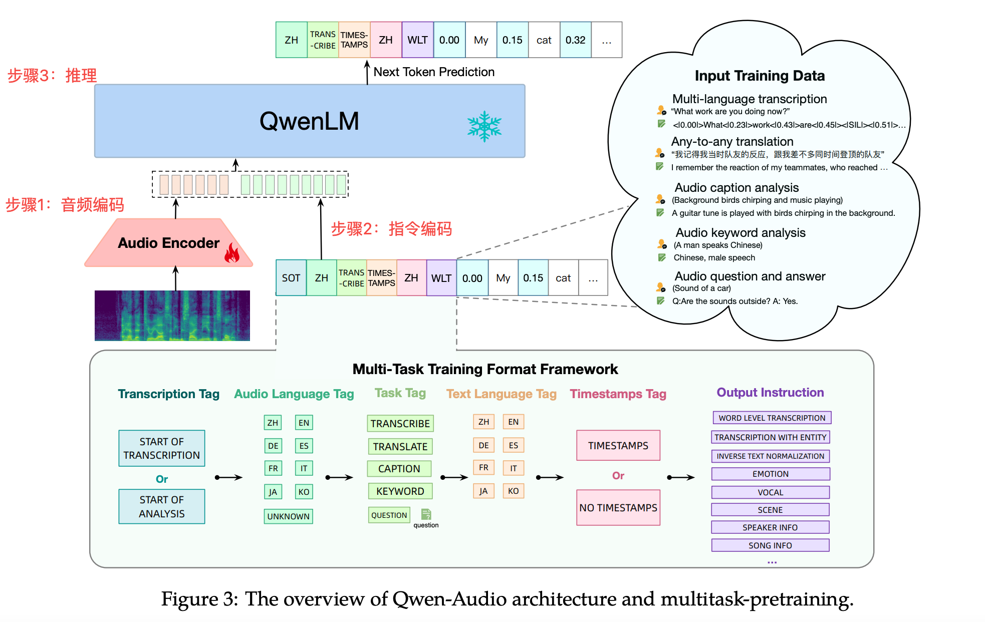 从架构图上可以看出,可以将推理过程分为3个步骤:音频编码、指令编码、LLM推理,其中音频编码和指令编码并无依赖关系,不过在Qwen-Audio代码实现过程中,需要获取音频编码后的长度,所以将音频编码放在步骤一。