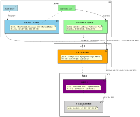 依赖关系 | 依赖后端提供的 API 接口 | 依赖后端提供的管理类 API 接口 | 可能依赖数据中台的数据分析结果 | 依赖各业务系统的原始数据 |