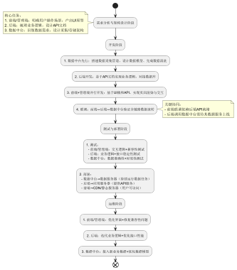 联调阶段:前端调用后端 API,后端调用数据中台接口(若有),验证全链路数据流转是否正确(如用户下单后,管理端能看到订单,数据中台能统计订单量)。