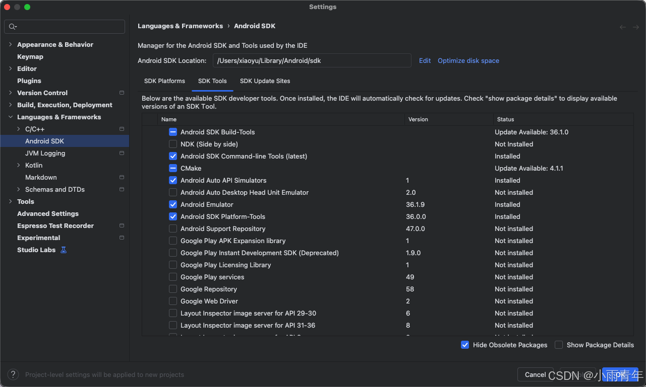 首次启动后打开 Preferences → Android SDK。你在 SDK Platforms 勾选 Android 15(API 35)→ Android SDK Platform 35,在 SDK Tools 勾选 Android SDK Build-Tools 35.x.x,并确保 Android SDK Platform-Tools 为最新(这包里包含 adb 等关键工具)。