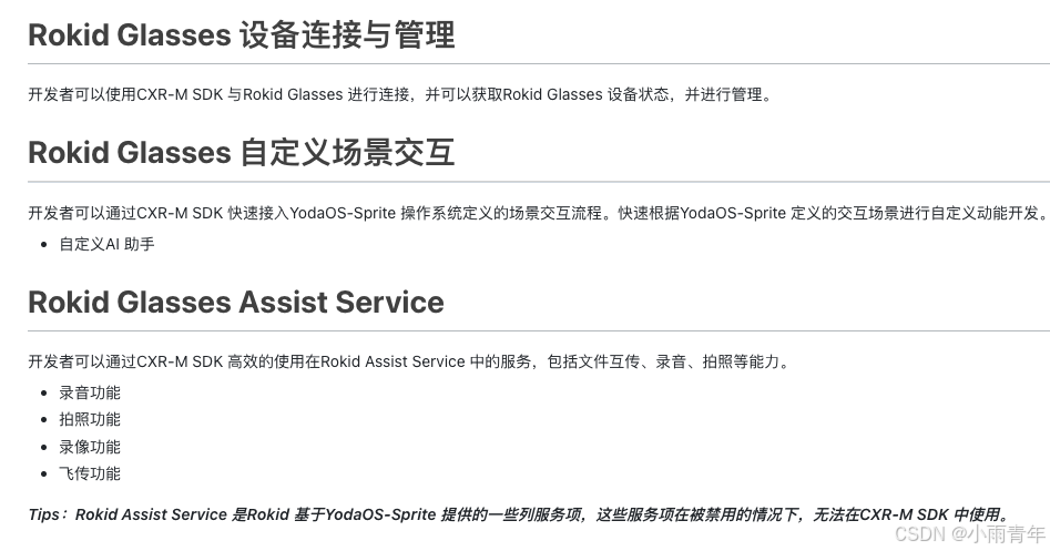 第二位是 CXR-S,它是跑在 Sprite 设备上的开发包,作用是让眼镜端可以直接访问数据通道,并且把“自定义命令”从眼镜侧发回到手机侧的 CXR-M。这个能力意味着你可以在眼镜端做一小段定制逻辑,然后通过通道和手机侧配合,从而把整体体验拆成“眼镜端轻逻辑 + 手机端重逻辑”的结构,这样一来你既不把眼镜端做得太重,也不把手机端做得太盲。