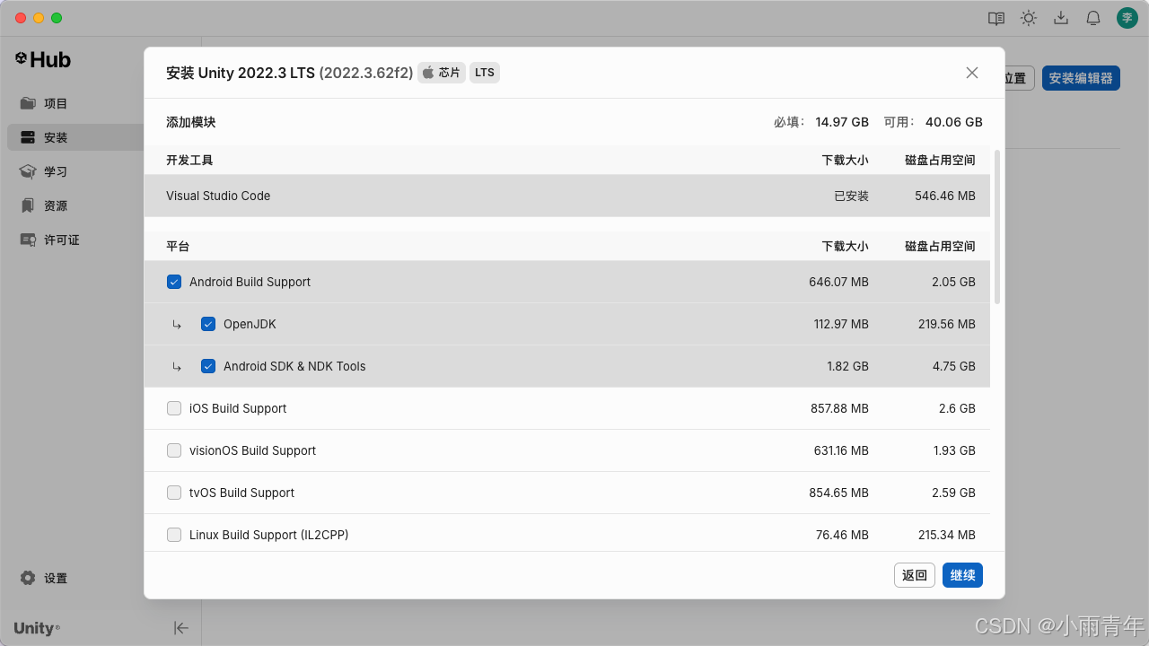 (官方说明“Android Build Support+SDK/NDK/OpenJDK”应随 Hub 一起安装)https://unity.com/releases/unity-6/support
