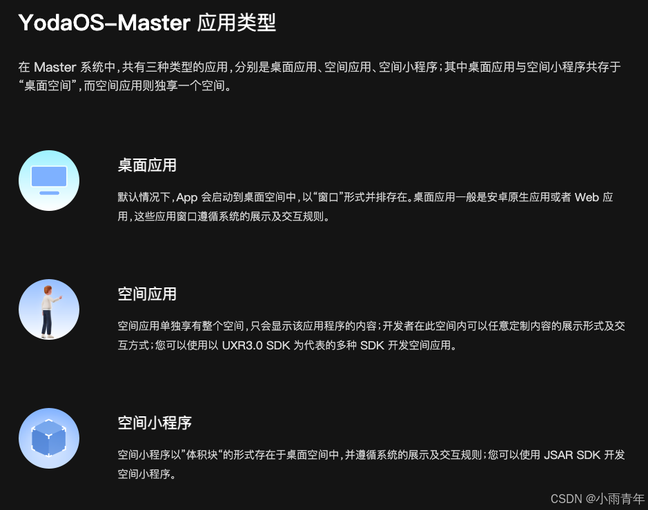 第二条线索是 YodaOS-Master,它是偏“空间计算”的系统底座,它把应用形态明确地分成三类,也就是“桌面应用、空间应用、空间小程序”。
