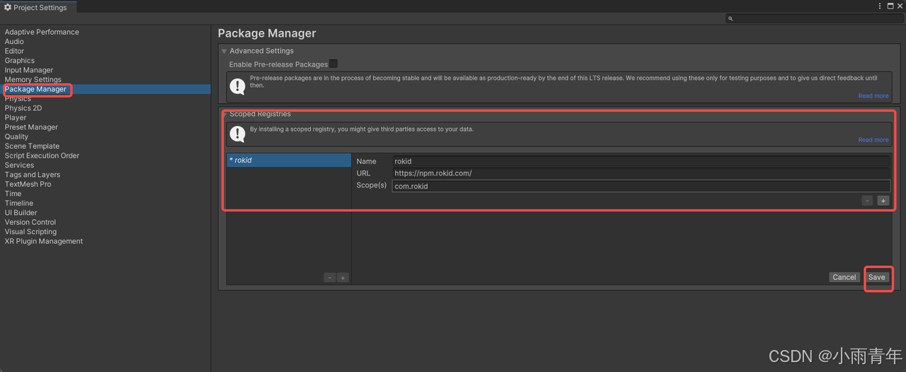 接着你在 Edit → Project Settings → Package Manager 里新增一个 Scoped Registry,用来从 Rokid 的私有 npm 仓库拉包: