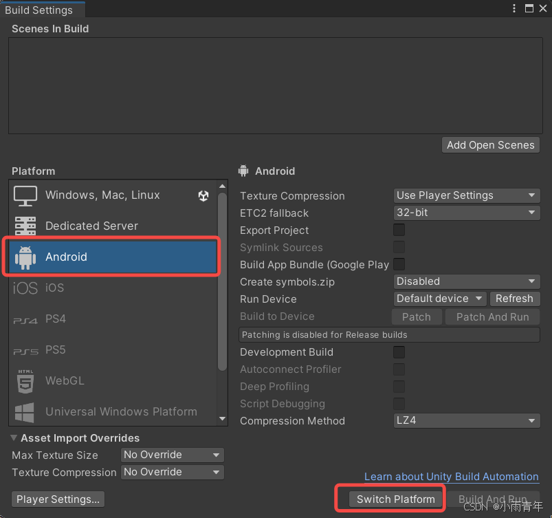 你把平台切到 Android,这是因为 UXR3.0 的 App 跑在 Android / YodaOS-Master 上。你在 File → Build Settings 里选择 Android,然后点击 Switch Platform。这一步只是一句带过,它不是本节重点,但不切会影响后续校验项。官方接入指南就是这么要求的。