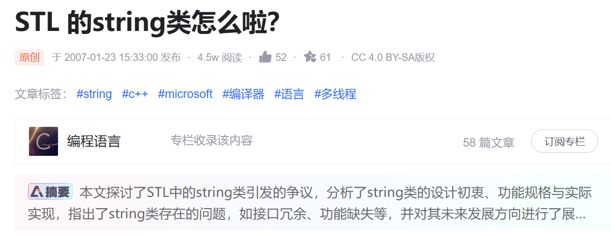 正是这些局限性,使得 C 语言处理字符串时效率低、bug 率高。而 C++ 的string