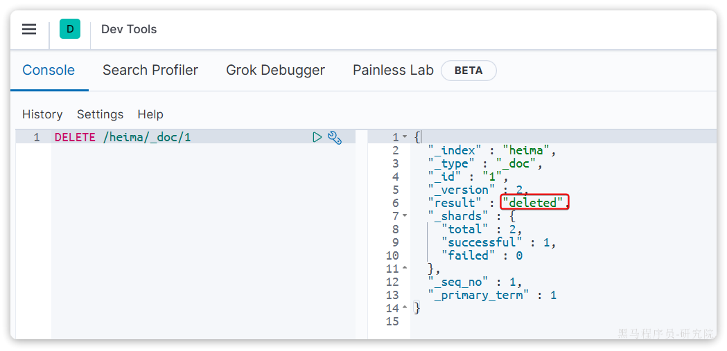 void testDeleteDocument() throws IOException {// 1.准备Request,两个参数,第一个是索引库名,第二个是文档idDeleteRequest request = new DeleteRequest("item", "100002644680");// 2.发送请求client.delete(request, RequestOptions.DEFAULT);