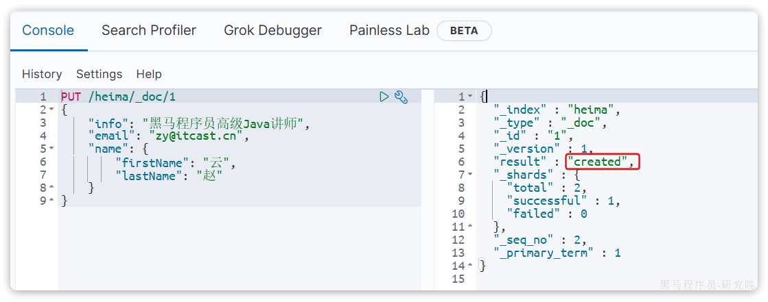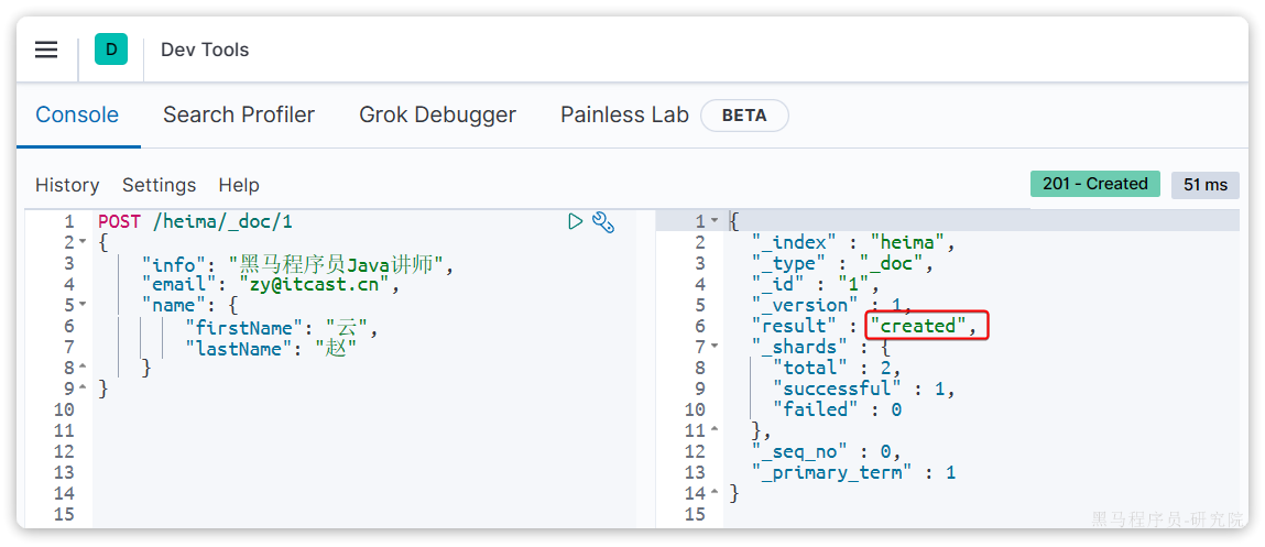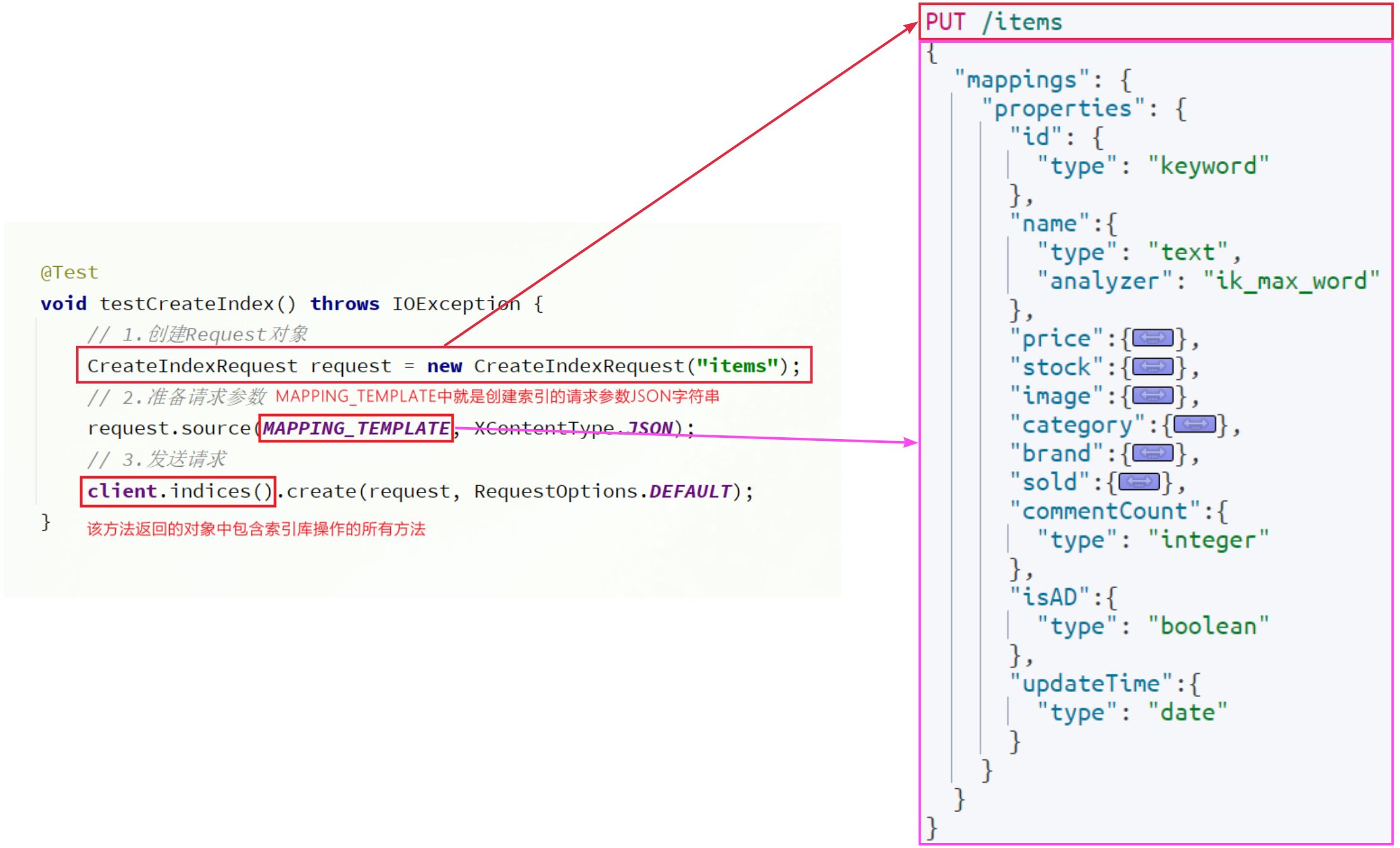 public class DocumentTest {private RestHighLevelClient client;@Autowiredprivate IItemService itemService;@Testvoid testAddDocument() throws IOException {// 1.根据id查询商品数据Item item = itemService.getById(100002644680L);// 2.转换为文档类型ItemDoc itemDoc = BeanUtil.copyProperties(item, ItemDoc.class);// 3.将ItemDTO转jsonString doc = JSONUtil.toJsonStr(itemDoc);// 1.准备Request对象IndexRequest request = new IndexRequest("items").id(itemDoc.getId());// 2.准备Json文档request.source(doc, XContentType.JSON);// 3.发送请求client.index(request, RequestOptions.DEFAULT);}@BeforeEachvoid setUp() {this.client = new RestHighLevelClient(RestClient.builder(HttpHost.create("http://192.168.150.101:9200")));}@AfterEachvoid tearDown() throws IOException {this.client.close();}