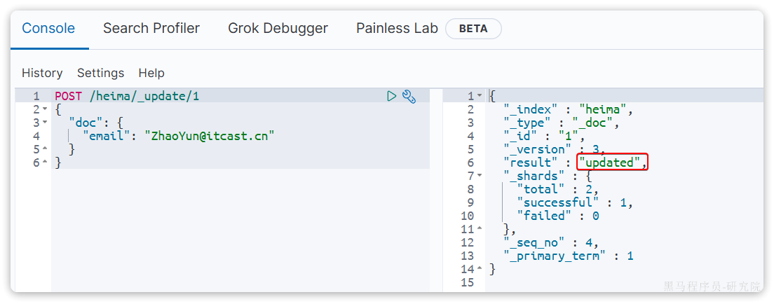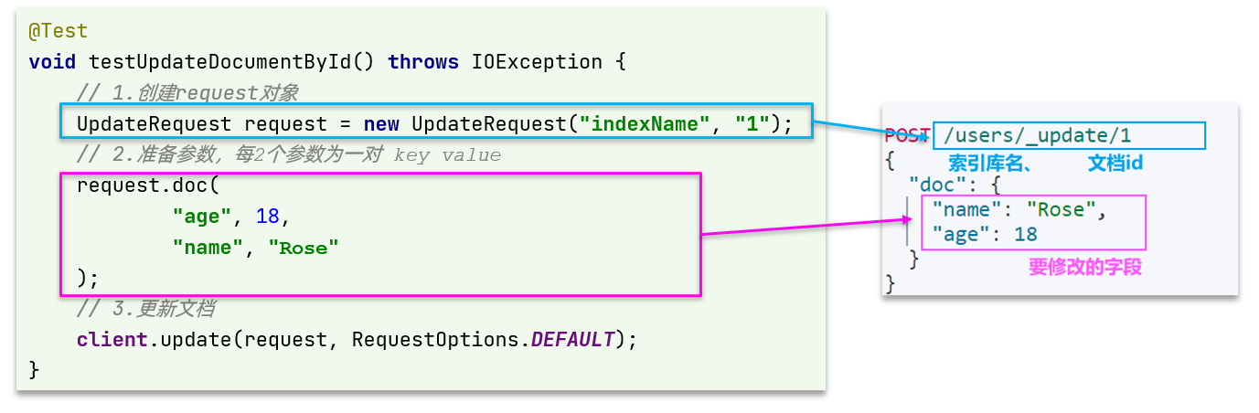 void testUpdateDocument() throws IOException {// 1.准备RequestUpdateRequest request = new UpdateRequest("items", "100002644680");// 2.准备请求参数request.doc("price", 58800,"commentCount", 1);// 3.发送请求client.update(request, RequestOptions.DEFAULT);