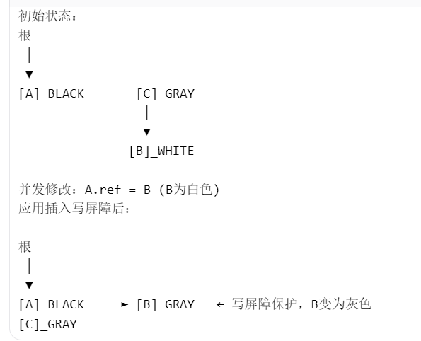 插入写屏障:当程序尝试将一个引用从对象 A 添加到对象 B 时,如果 B 是白色(未被标记),则立即对 B 进行标记(变为灰色)。