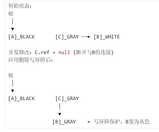 删除写屏障:当程序尝试删除对象 C 中的一个引用(假设指向 B)时,如果 B 是白色,则立即将 B 标记为灰色。