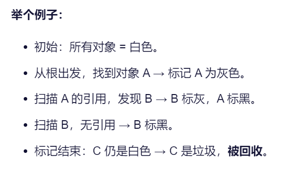 - 根扫描(Root Scan):从根对象(如全局变量、栈变量)出发,将直接可达的对象标记为灰色,放入待处理队列。