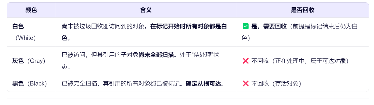 - 白色(White):尚未被访问的对象,可能为垃圾。
