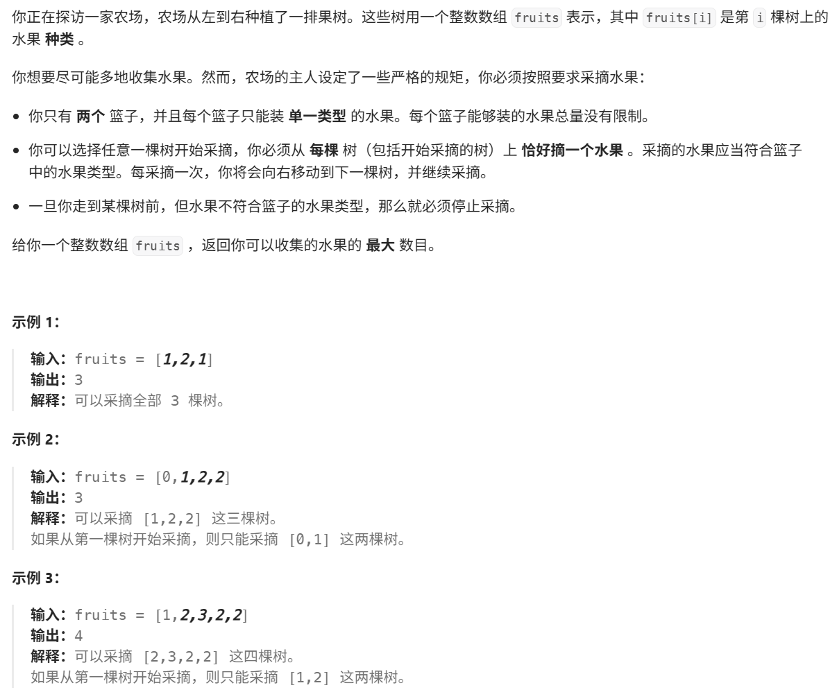 i 棵树,fruits[i]表示第 i 棵果树的水果种类,只有2个篮子且每个篮子只能装单一类型的水果;可以选择从任意一棵树开始摘,每棵树摘完1颗向右移动并继续采摘,一旦走到某棵树前,2个篮子都不能装,停止采摘。现在要求2个篮子可采摘水果数量的最大值。