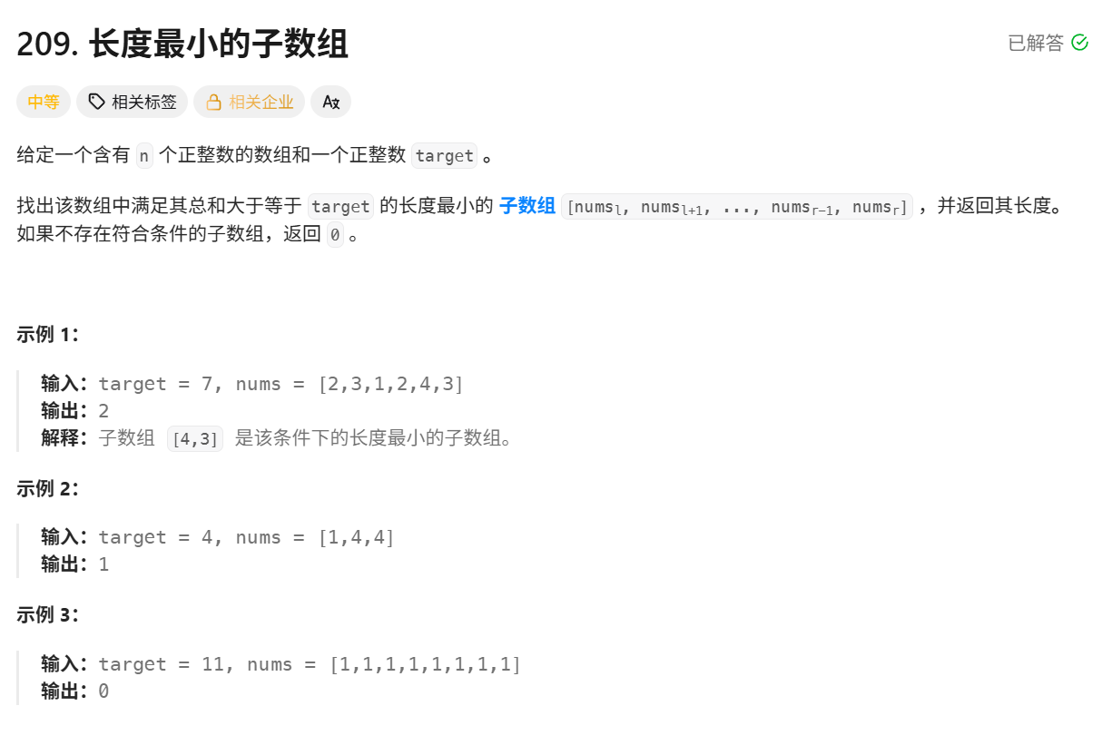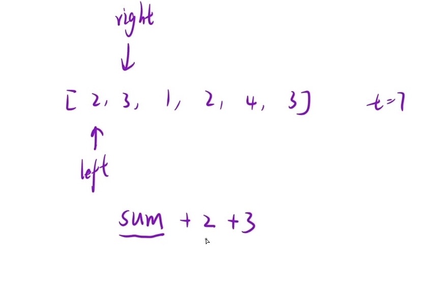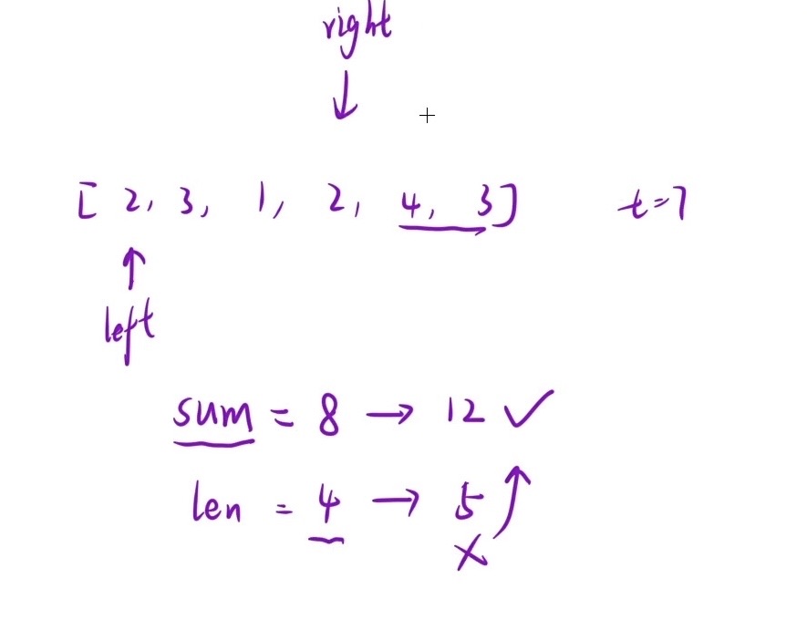 public:int minSubArrayLen(int target, vector<int>& nums) {int left, right;int sum = 0, min = INT_MAX;for (left = 0, right = 0;right <= nums.size() - 1;){while (right <= nums.size() - 1 && sum < target) sum += nums[right++];while (sum >= target){int len = right - left;if (len < min) min = len;sum -= nums[left++];}}if(min == INT_MAX) return 0;return min;}