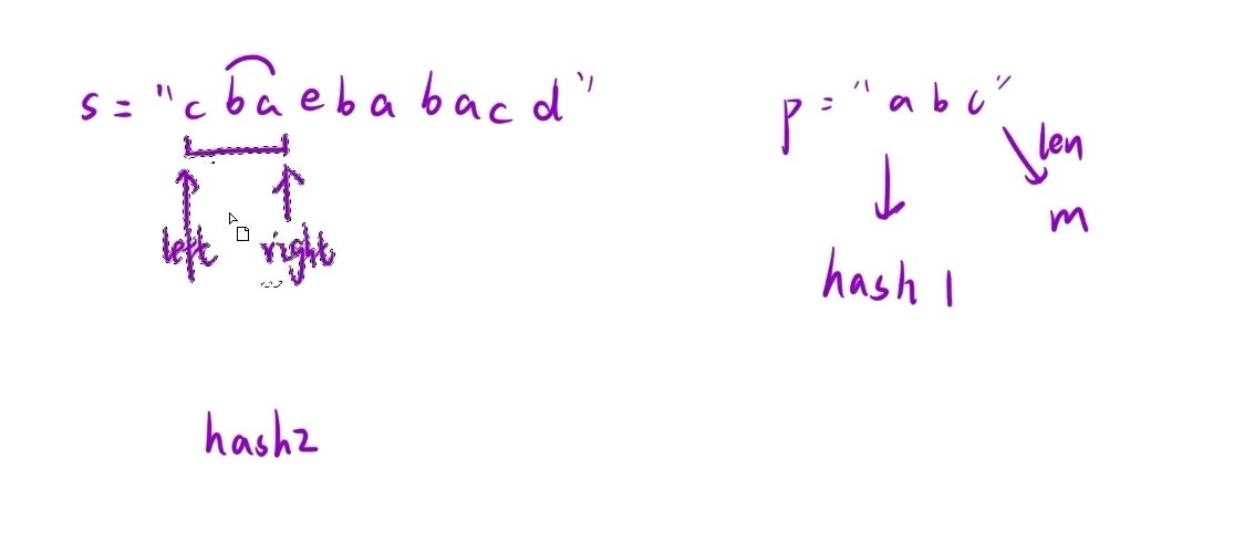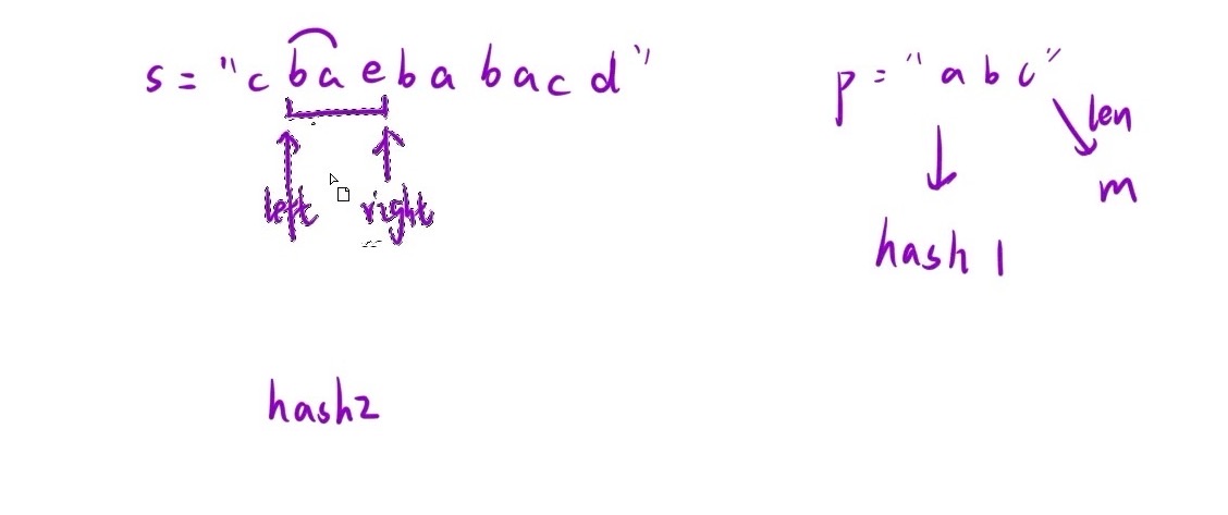 每次进窗口,出窗口判断一次hash表中的字符构成,如果相同就返回起始下标,不同就继续