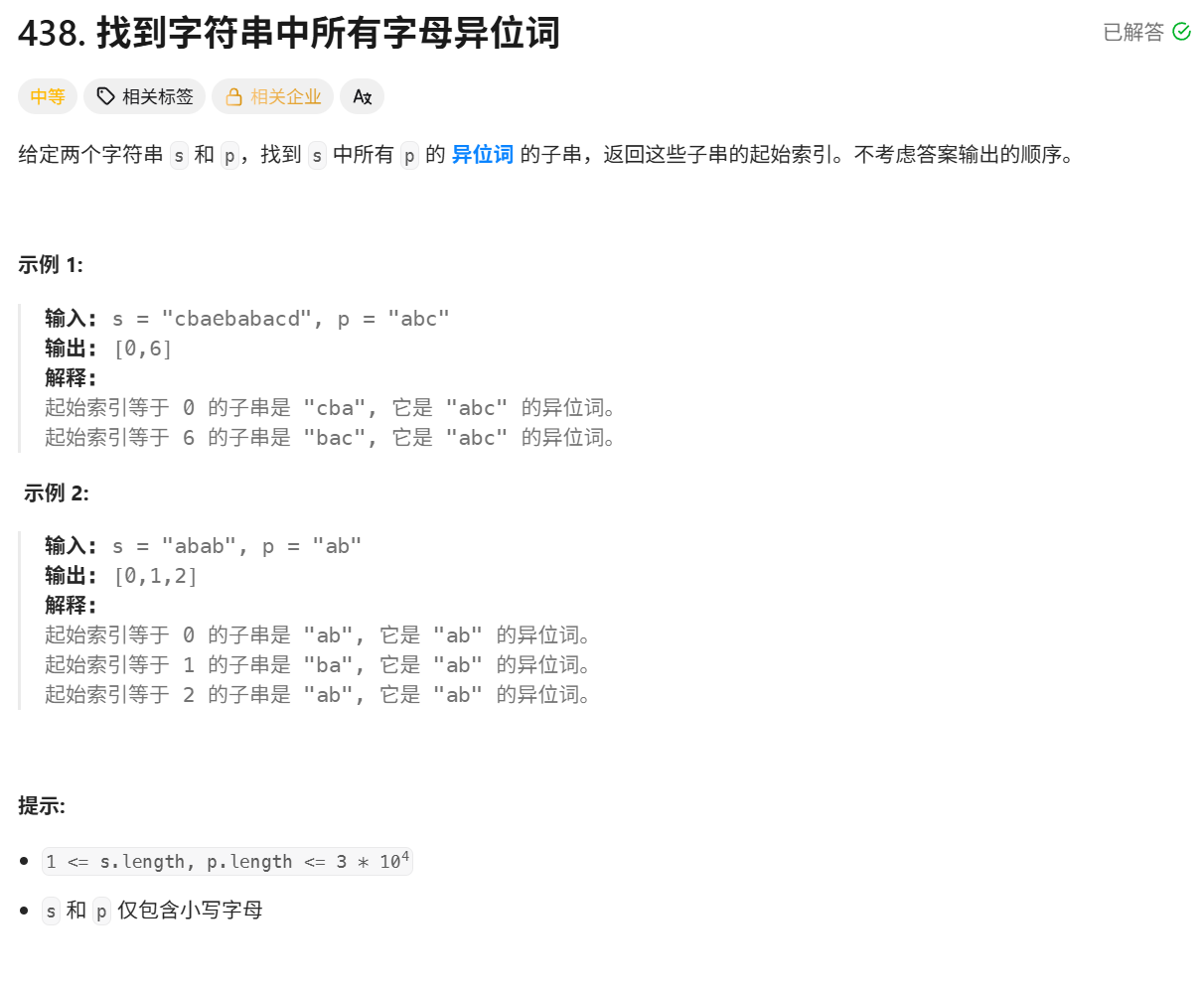 public:vector<int> findAnagrams(string s, string p) {if(s.size()<p.size()) return {};vector<int> hash1(26,0);vector<int> hash2(26,0);vector<int> ret;int count = 0;for(auto i:p) hash2[i-'a']++;for(int left=0,right=0;right<=s.size()-1;right++){//进窗口hash1[s[right]-'a']++;//进窗口判断if(hash1[s[right]-'a']<=hash2[s[right]-'a']) count++;//长度判断while(right-left+1>p.size()){//出窗口判断if(hash1[s[left]-'a']<=hash2[s[left]-'a']) count--;//出窗口hash1[s[left]-'a']--;left++;}//结果判断if(right-left+1 == p.size() && count == p.size()) ret.push_back(left);}return ret;}