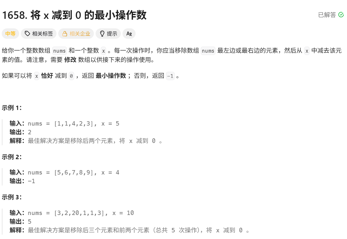public:int minOperations(vector<int>& nums, int x) {int sum = 0 ;for(auto i:nums) sum+=i;int flag = sum - x;if(flag<0) return -1;if(flag == 0) return nums.size();int size=nums.size(),left,right,max=0,add=0;for(left=0,right=0;left<=size-1,right<=size-1;){while(right<=size-1 && add<flag) add+=nums[right++];while(left<=size-1&&add>=flag){if(add == flag) {if(right-left>max) max = right-left;}add-=nums[left++];}}if(!max) return -1;return size-max;}