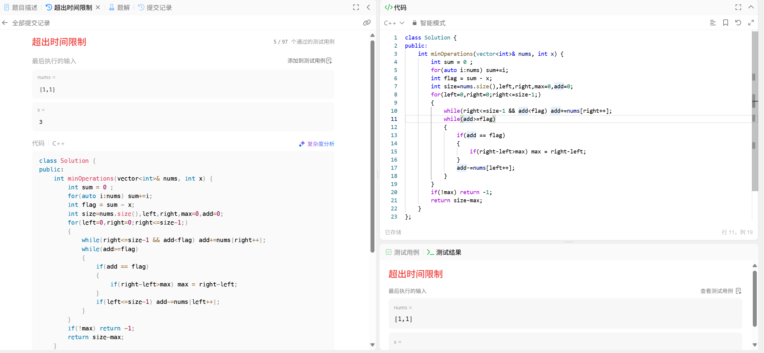 当子数组的和大于sum-x,left++(出窗口);当子数组的和小于sum-x,right++(进窗口);当子数组的和等于sum-x时,更新操作数次数,同时left++