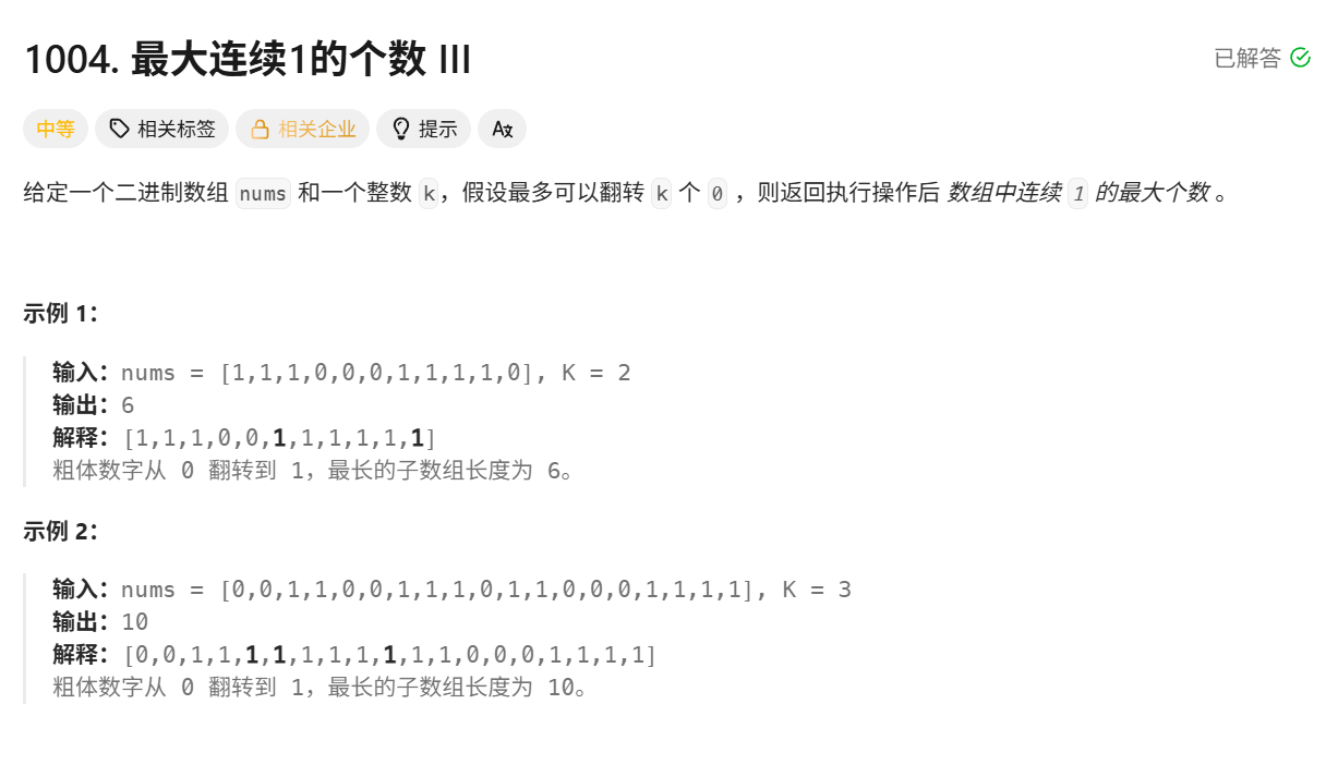 有个2进制数组,里面的0可以从0翻转成1,至多翻转k个0(可以翻转0个、1个、……、k个)之后,求出最长的连续1个数