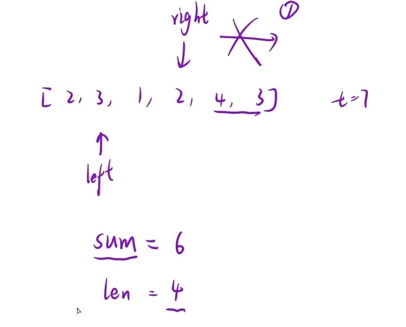 - 极限情况:不可能达到target的情况,right不断相加,超出了数组范围还是比target小,直接返回0