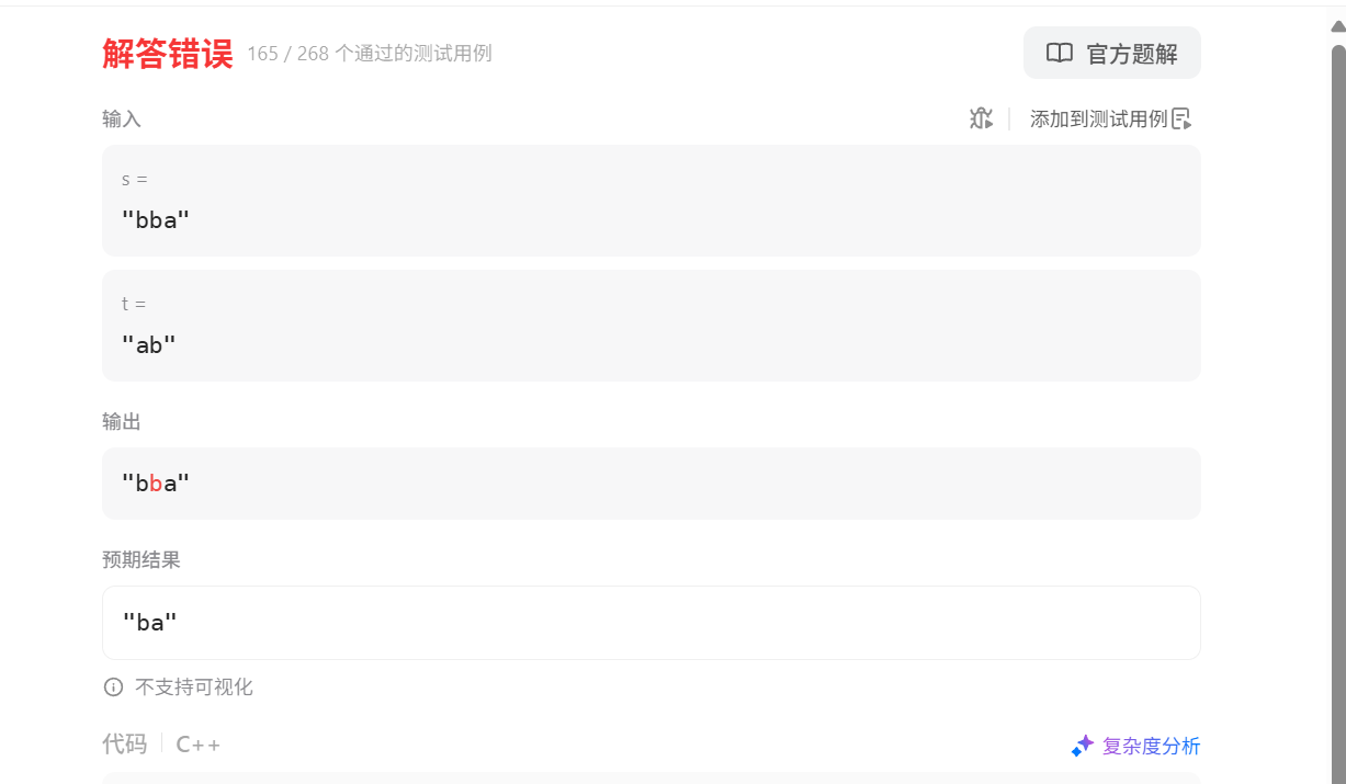笔者在尝试了9981个小时后,发现把left移动到存在于 t 中的字符上来解决问题不太可行,因此换成了下面的方法