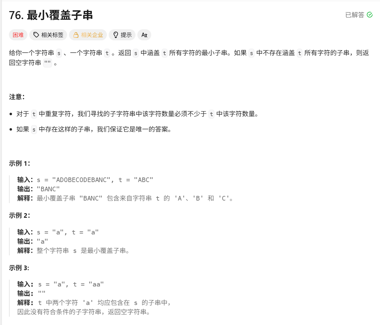public:string minWindow(string s, string t) {string ret;if(s.size()<t.size()) return ret;vector<int> hash1(150,0);vector<int> hash2(150,0);int len_min = INT_MAX;int left_min = -1, right_min = -1,count = 0;int left,right;for(auto x:t) hash1[x]++;for(left=0,right=0;right<=s.size()-1;right++){//进窗口+有效字符添加判断char in = s[right];hash2[in]++;if(hash2[in]<=hash1[in]) count++;//left提前移位while(left <= s.size()-1 && !hash1[s[left]]) left++;//出窗口+有效字符删除判断while(count == t.size() && right - left + 1 >= len_min){char out = s[left];if(hash2[out]<=hash1[out]) count--;hash2[out]--;left++;}//更新结果if(count == t.size()){left_min = left;right_min = right;len_min = right-left+1;}}if(right_min == -1) return ret;ret = s.substr(left_min,right_min-left_min+1);return ret;}